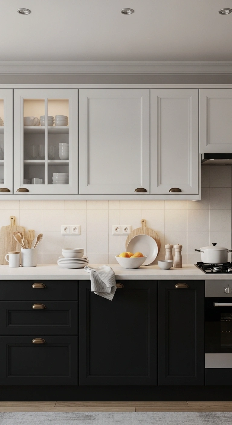 A split-tone kitchen with black lower cabinets and white upper cabinets creates a clean and balanced look. The black grounds the space while the white keeps it bright and open. This layout works especially well in smaller kitchens where full black might feel too heavy. Add a simple white backsplash with soft texture to connect both tones smoothly.
