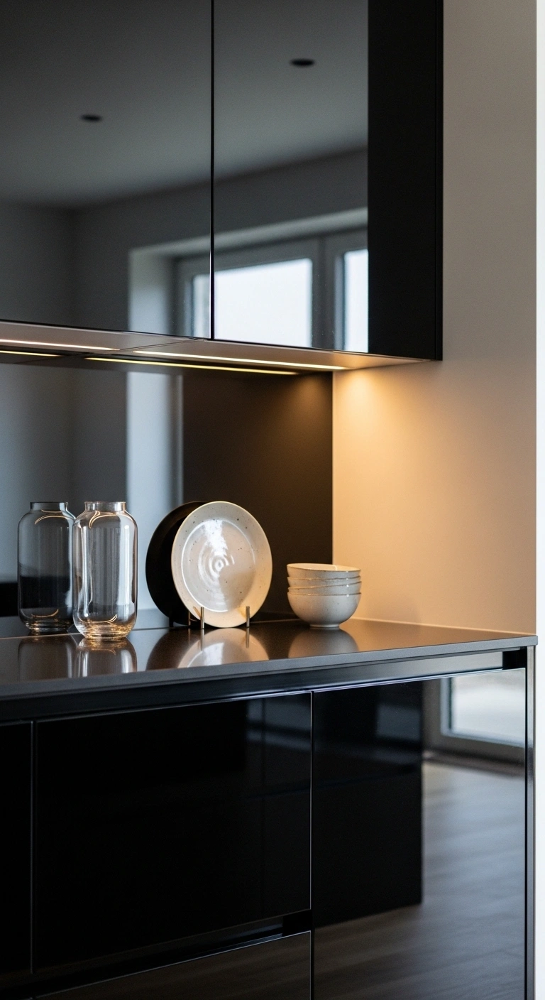 Glossy black cabinets bring a sleek and polished look that reflects light beautifully. This finish helps bounce light around the room, making even darker kitchens feel more open. Pair glossy cabinets with reflective materials like glass backsplashes or polished stone floors to enhance the effect and create a smooth, flowing space.
