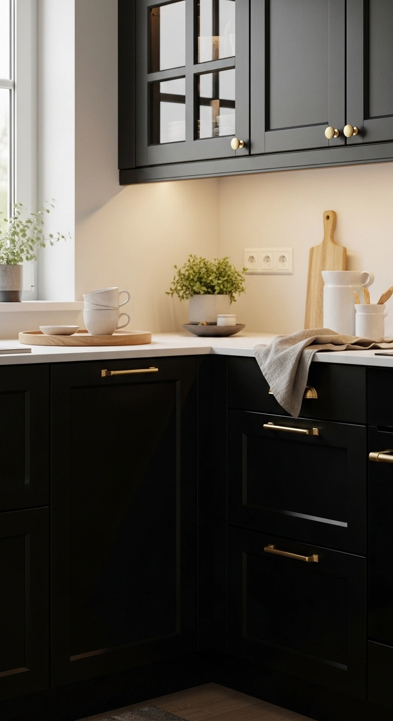 Black cabinets paired with gold hardware create a bold yet elegant look that feels timeless. The warmth of gold adds contrast and prevents the kitchen from feeling too dark. Choose brushed gold handles instead of shiny ones for a softer and more modern feel. This small detail can completely change the mood of the space.