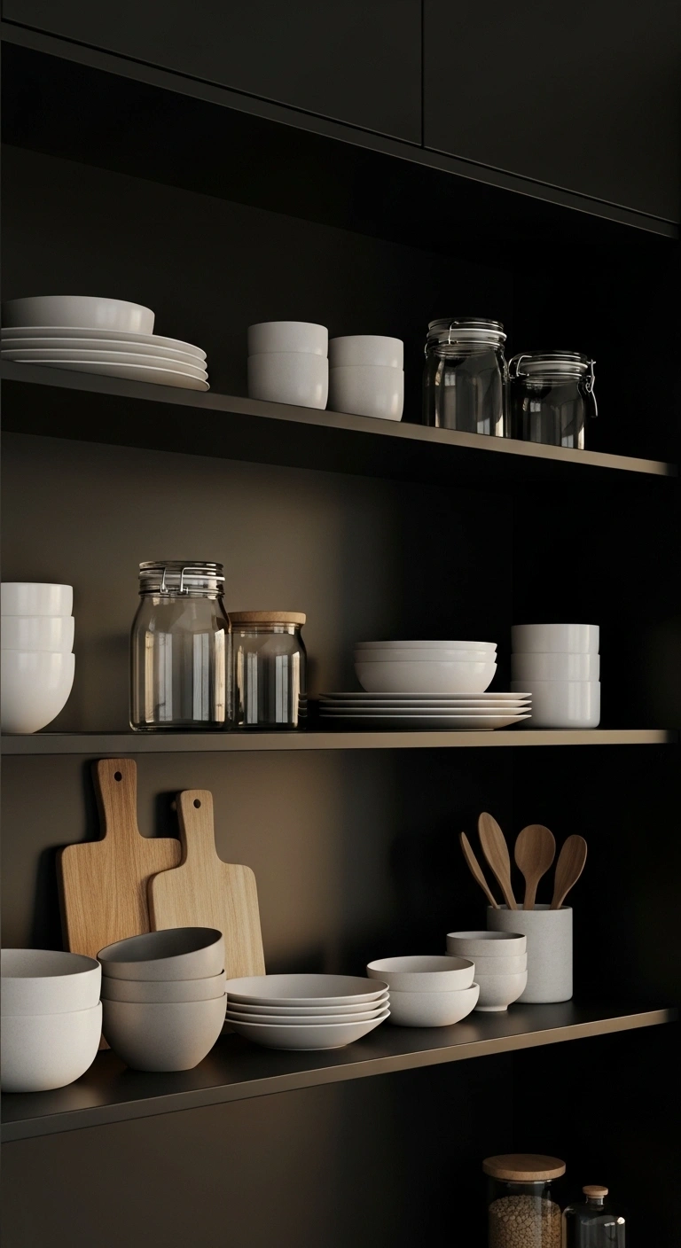 Black open shelves offer a lighter alternative to full cabinets while still keeping the bold look. Use them to display neutral dishes, glass jars, and wooden boards to create a layered and lived-in feel. The contrast between black shelves and lighter items helps each piece stand out clearly.