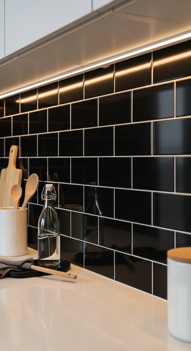Black subway tiles create a strong visual base, especially when paired with light grout. The contrast outlines each tile, adding pattern and structure without extra decoration. This simple detail brings interest while keeping the overall look clean and modern.