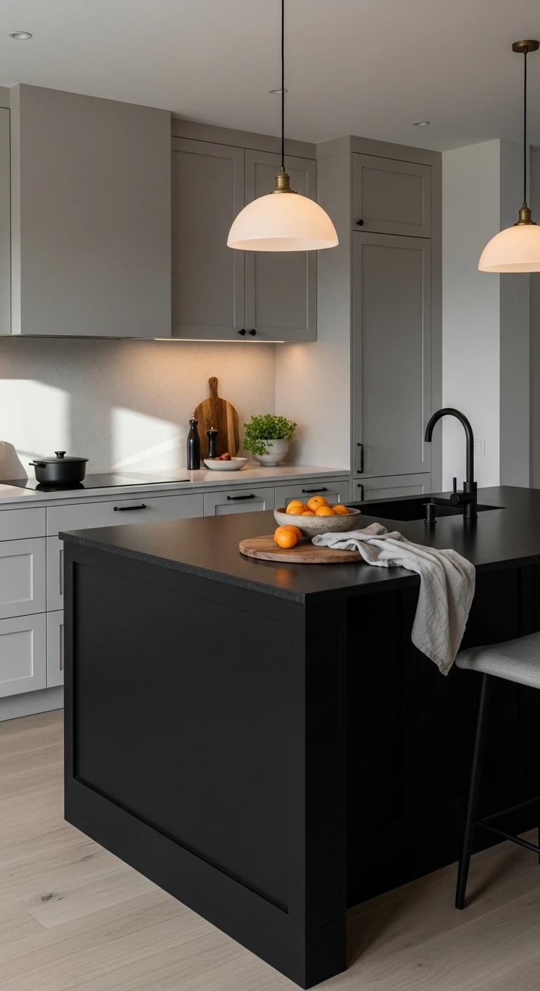 A black kitchen island can act as the focal point in a lighter kitchen. Keep surrounding cabinets in neutral tones like white or soft gray to let the island stand out. Choose a slightly different material for the island, such as wood or stone, to add texture and depth.