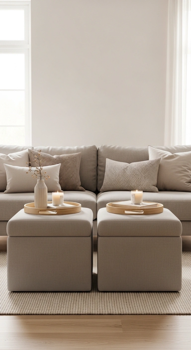 Keep the placement aligned with your main seating to maintain a clean visual line. You can add a tray on each ottoman with similar decor pieces like candles or small books to reinforce symmetry. This idea feels relaxed yet structured, giving your living room both comfort and visual harmony without feeling rigid.
