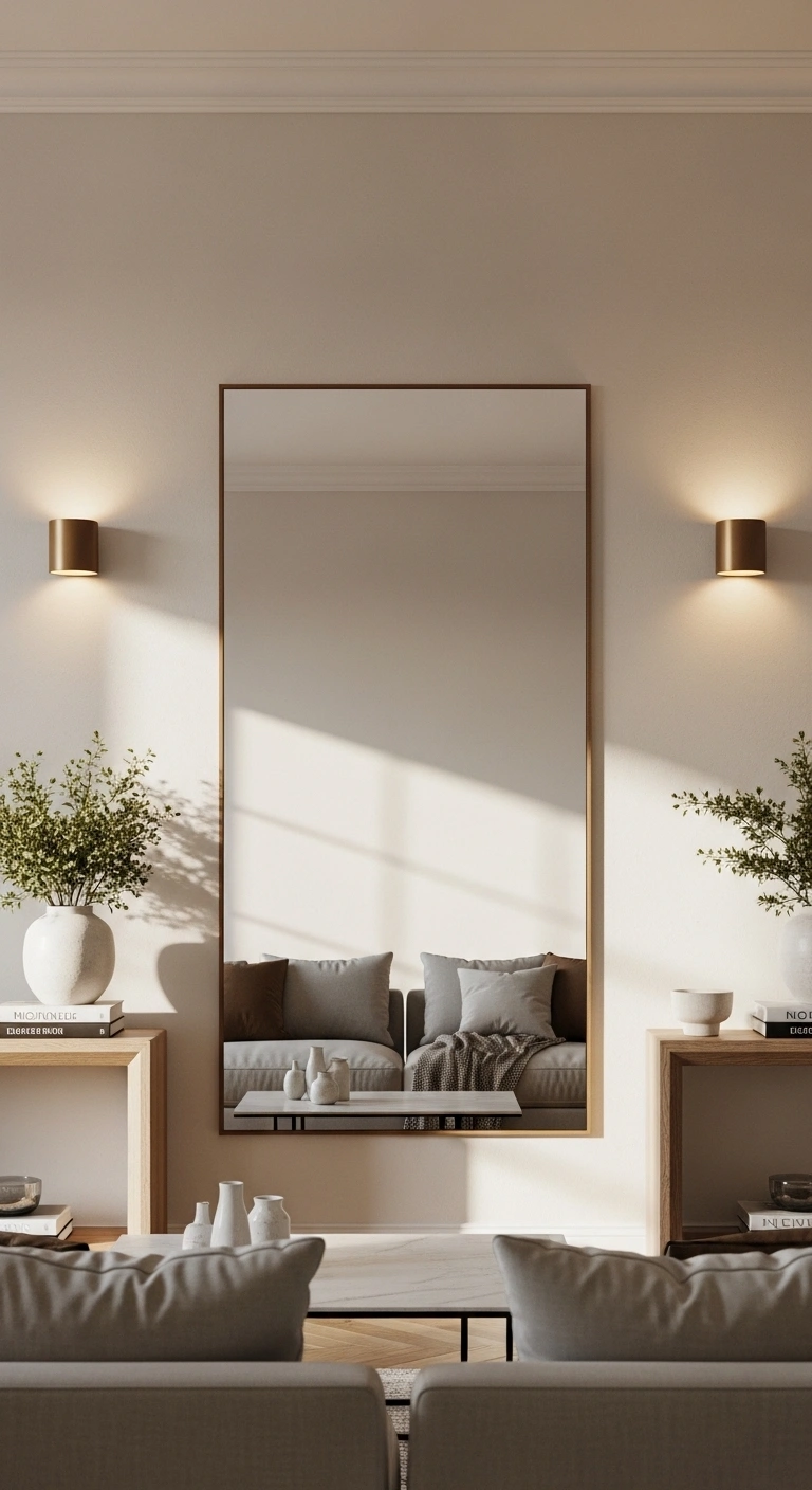 On each side of the mirror, add matching wall sconces, plants, or narrow consoles. The reflection helps double the visual effect, making the room feel even more balanced. This idea works especially well in smaller spaces where you want to create the illusion of depth while maintaining a clean and structured layout.