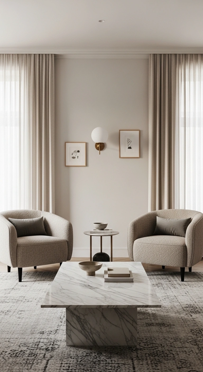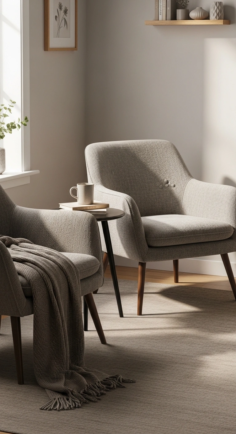 Position two identical accent chairs angled slightly toward a central table to create a cozy yet symmetrical seating area. This works well in corners or open spaces where you want to define a smaller zone within the living room. Choose chairs with soft curves or textured fabric to add warmth.