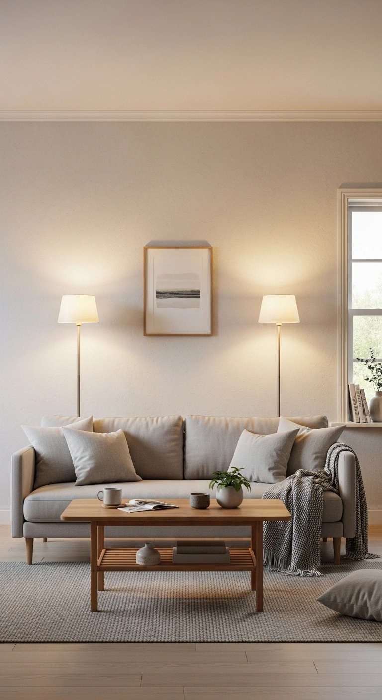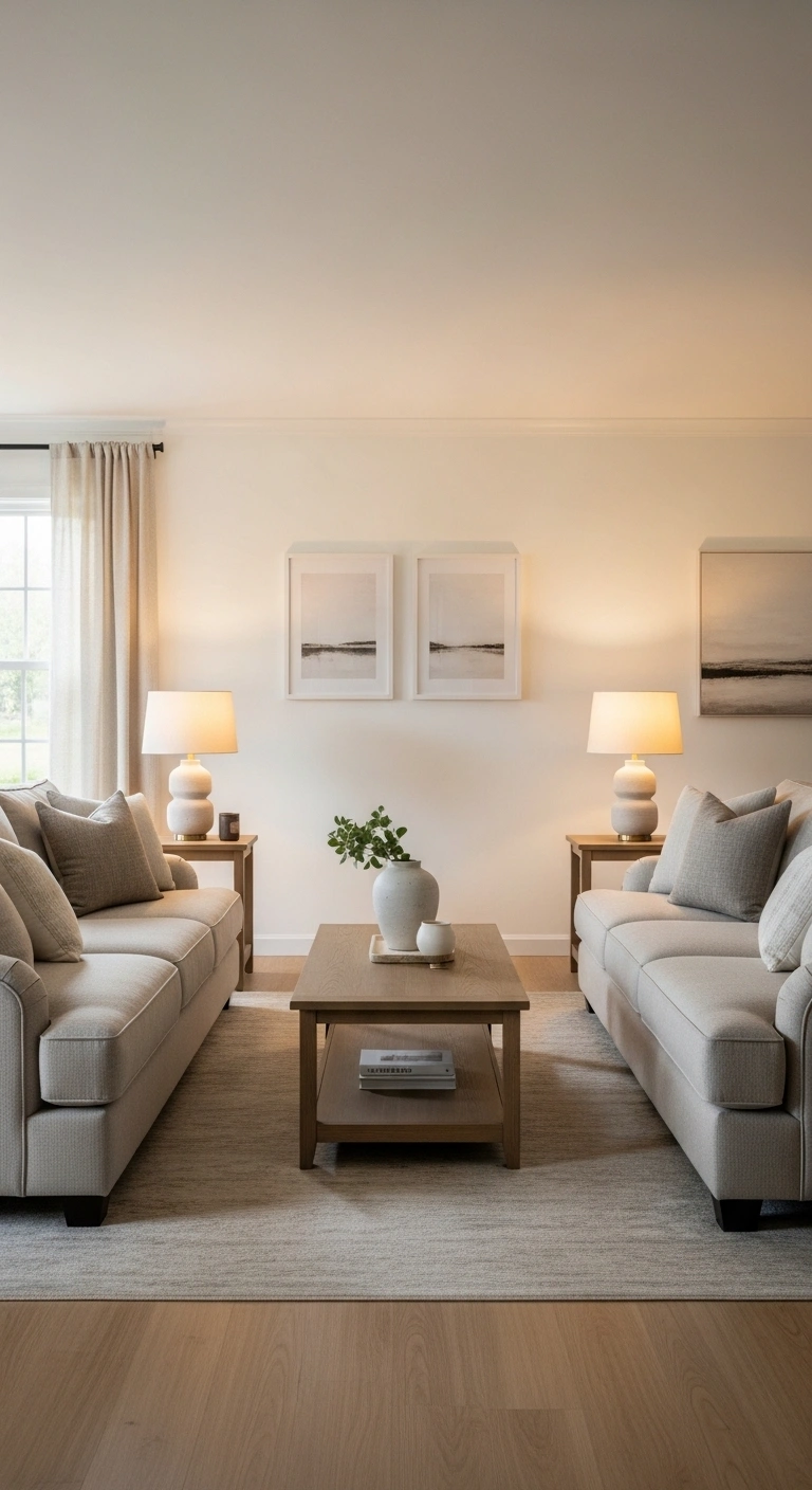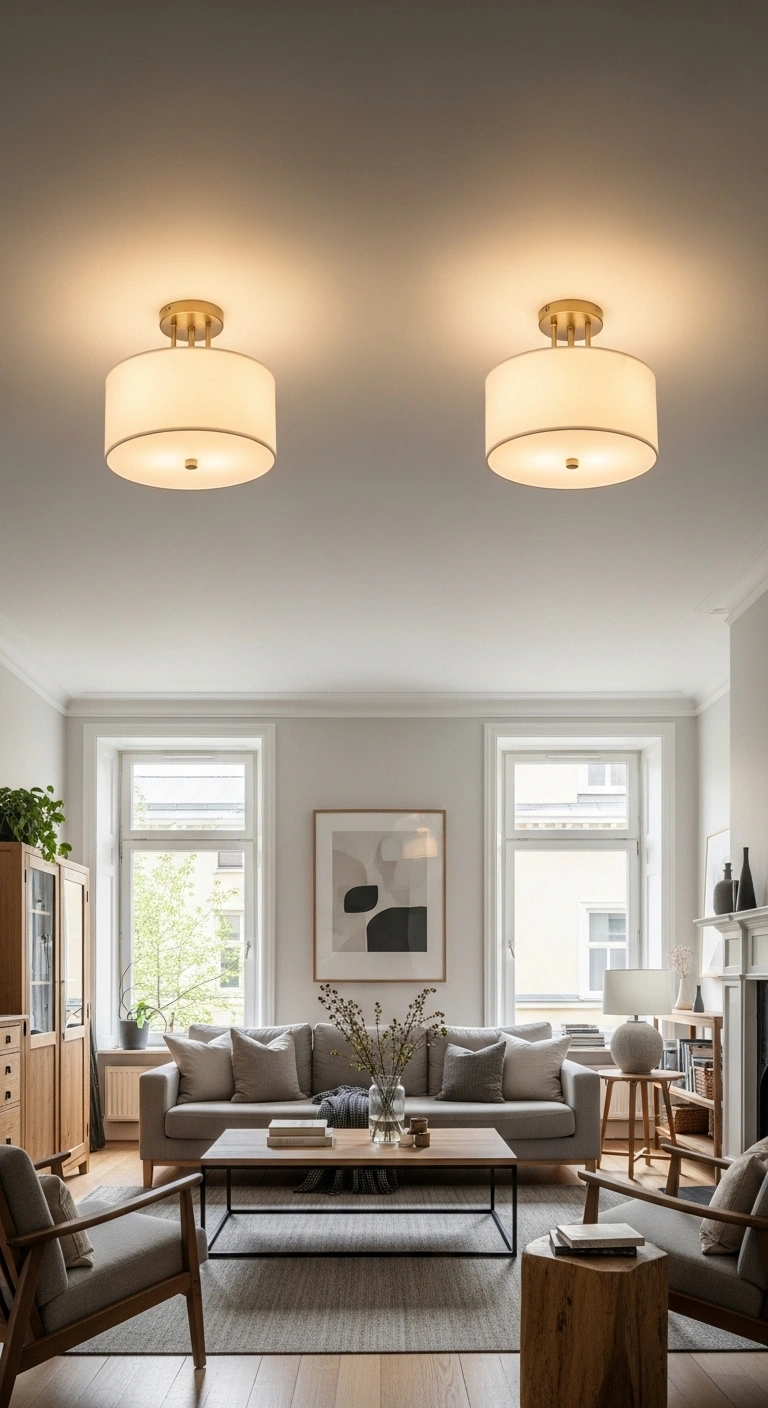 Install two identical ceiling fixtures or pendant lights spaced evenly across your living room. This ensures that light spreads evenly, eliminating dark corners and creating a balanced atmosphere. Choose fixtures with simple shapes and soft finishes like frosted glass or brushed metal.