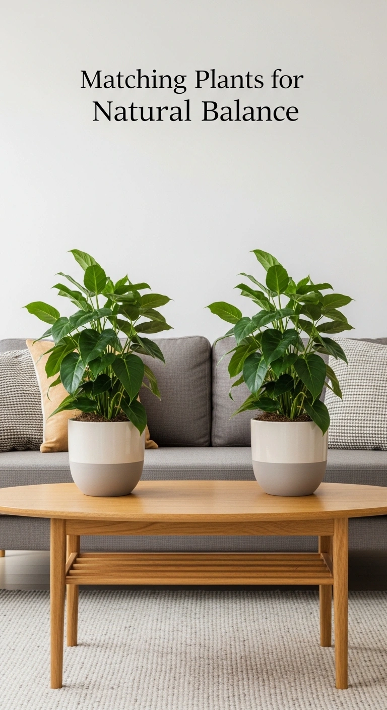 Use two identical indoor plants placed on either side of a sofa, console, or window to bring life into your symmetrical layout. Choose plants with similar height and shape, such as fiddle leaf figs or tall palms, for a clean and balanced look.