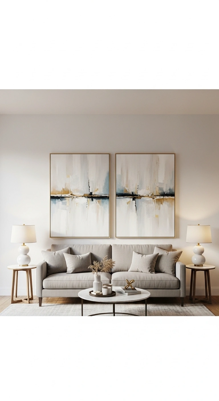 Hang two identical or closely related artwork panels side by side to create a balanced focal point. This works well above a sofa or console table. Choose art with soft colors, abstract shapes, or minimal patterns to keep the space calm and cohesive.
