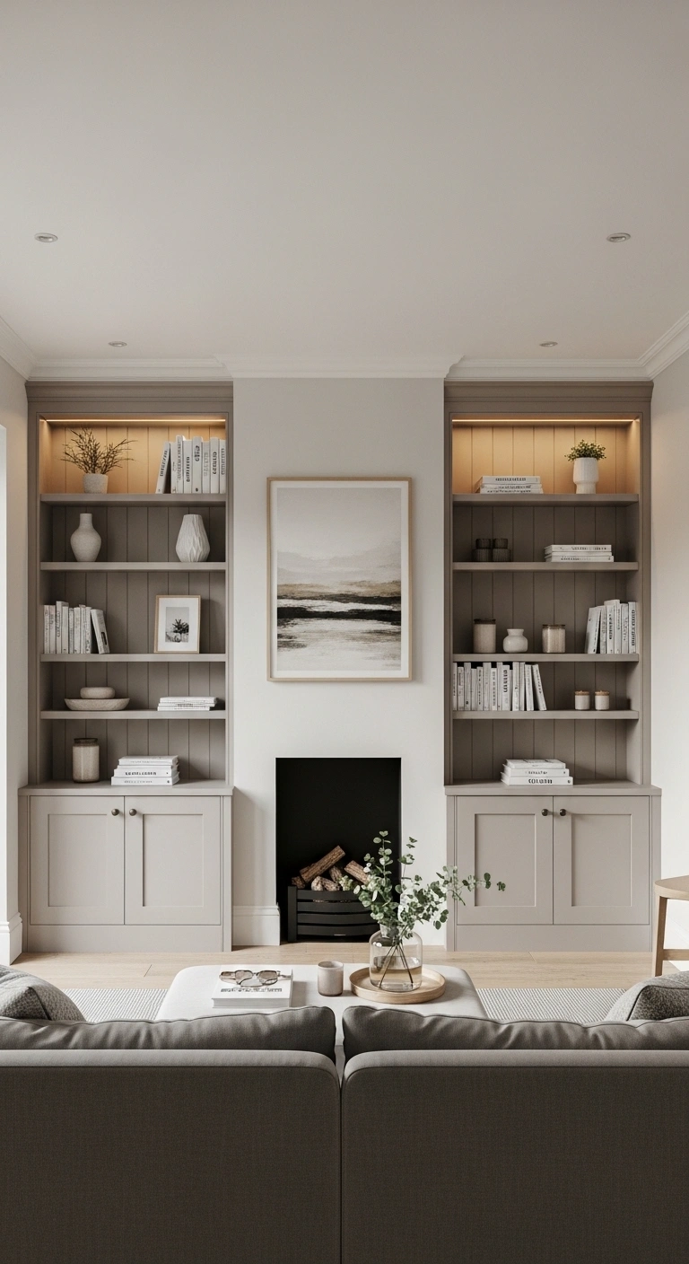 Install built-in cabinets on both sides of a central feature like a TV or fireplace. This creates a strong architectural symmetry that feels polished and intentional. Choose finishes like matte white, soft gray, or natural wood for a timeless look.
