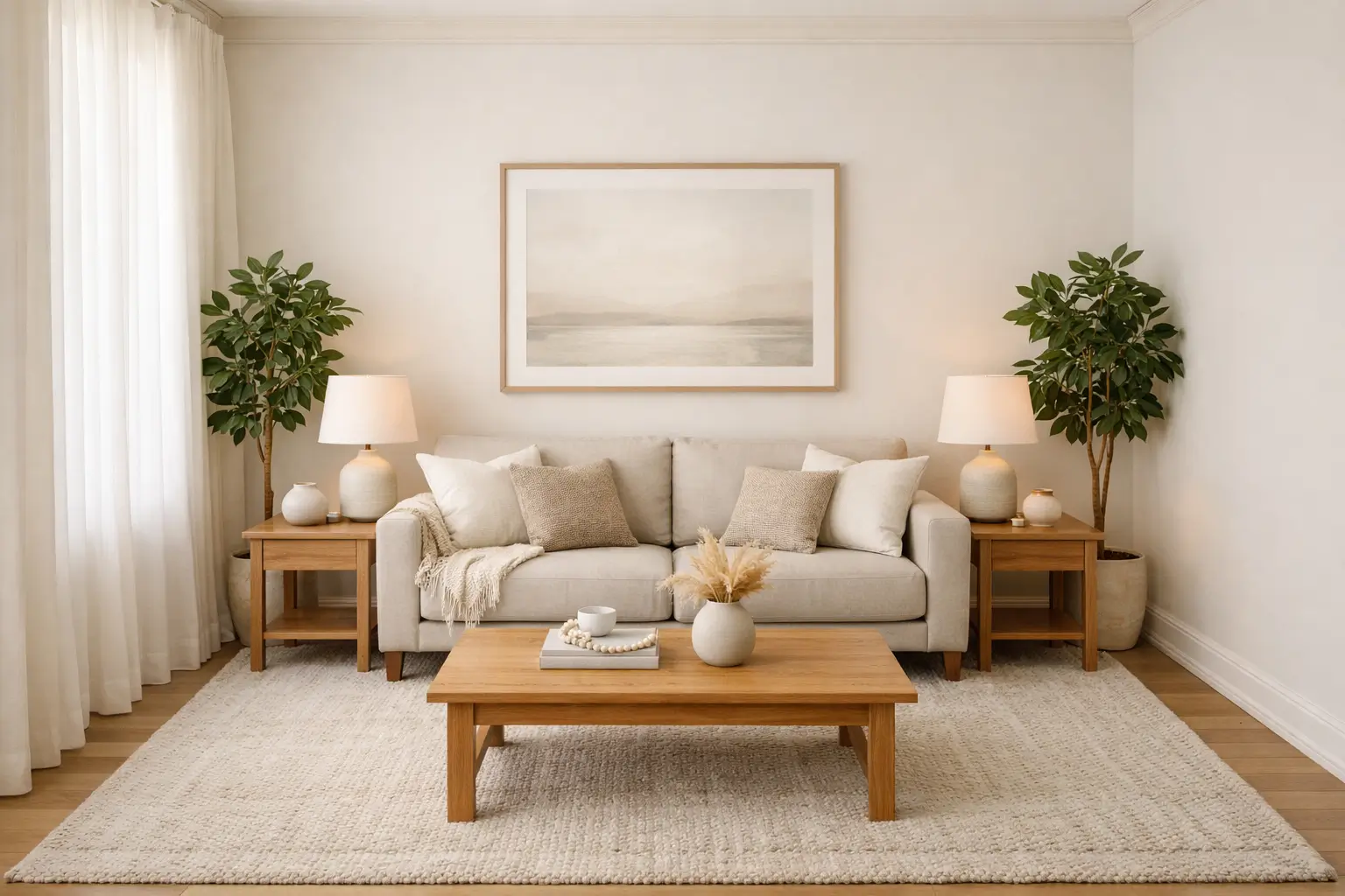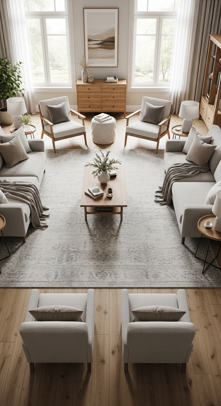Start with a large rug placed exactly in the center of your living room. Arrange your furniture evenly around it, ensuring equal spacing on both sides. This creates a clear layout that feels grounded and visually stable.