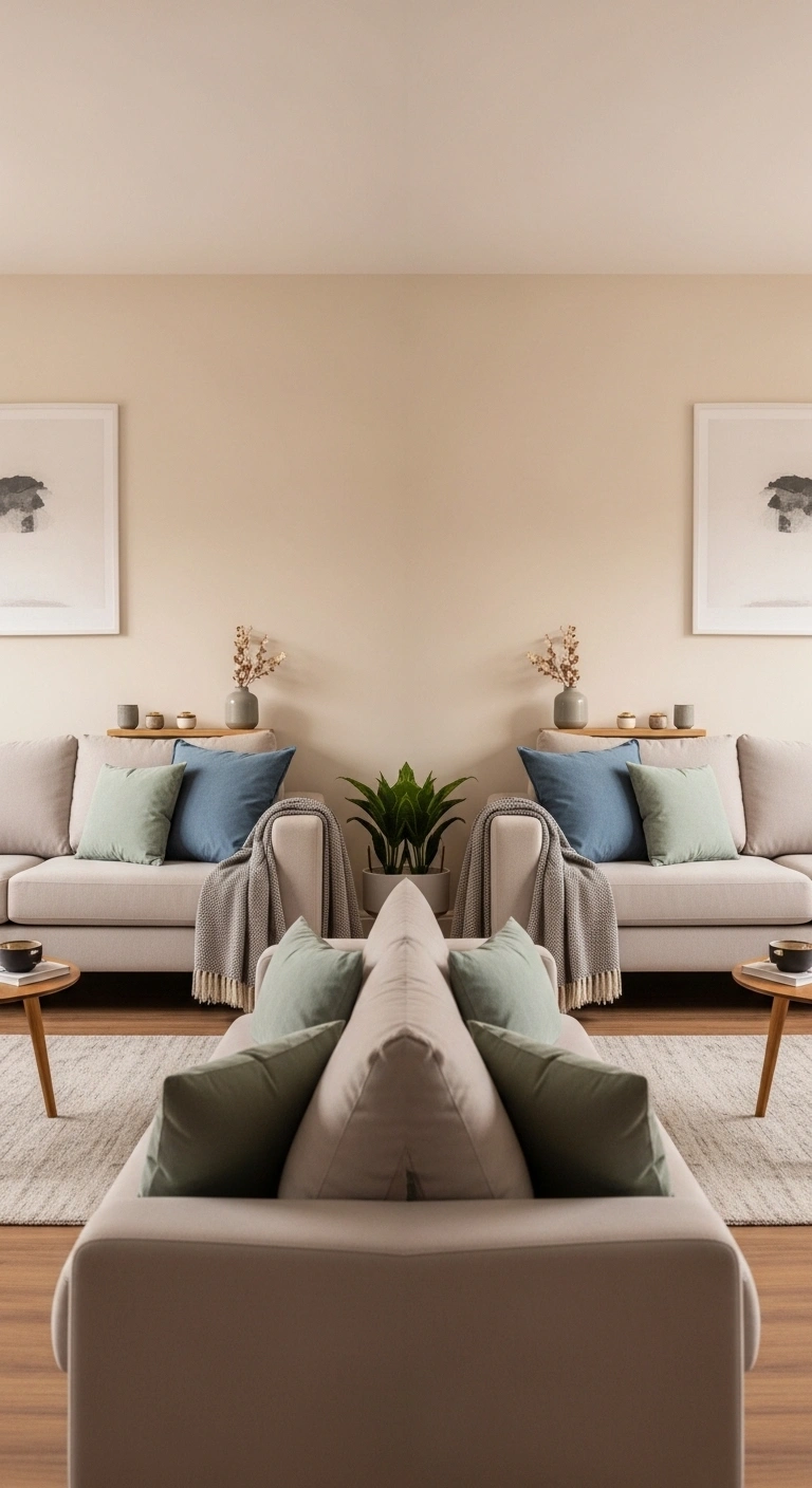 Use color in a symmetrical way by repeating the same shades on both sides of the room. For example, if you have a blue cushion on one side of the sofa, place a similar one on the other side. This creates a subtle but powerful sense of balance.