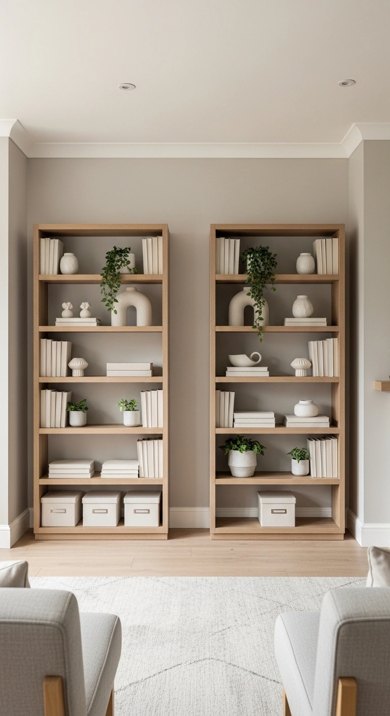 Place identical bookshelves on either side of a fireplace, TV unit, or central wall feature. This creates a strong visual anchor while adding storage and display space. Choose shelves in wood tones or painted finishes that match your room’s color palette.