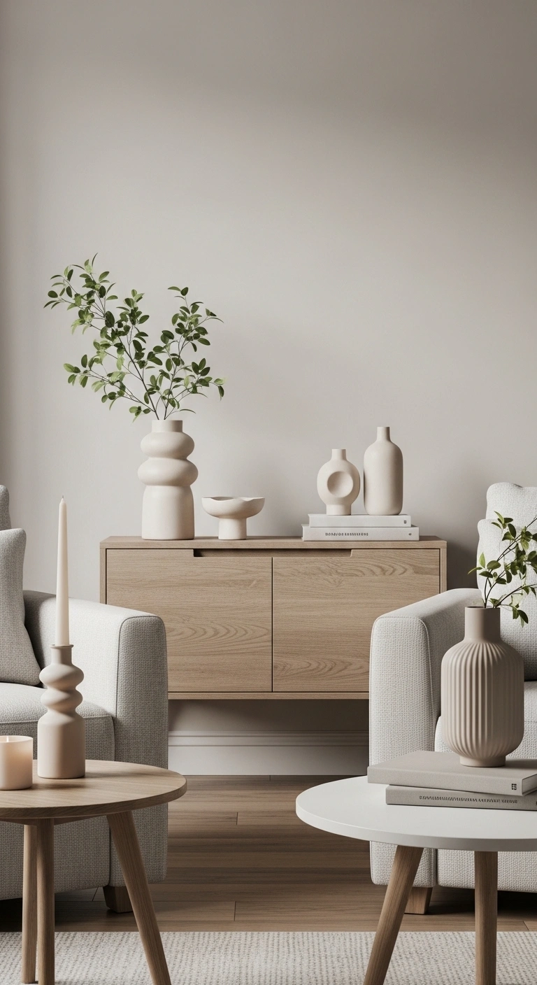 Use pairs of decorative objects like vases, candles, or sculptures to create a sense of rhythm in your living room. Place them on shelves, tables, or mantels in a way that mirrors each side. This repetition creates a calming visual pattern that feels intentional.