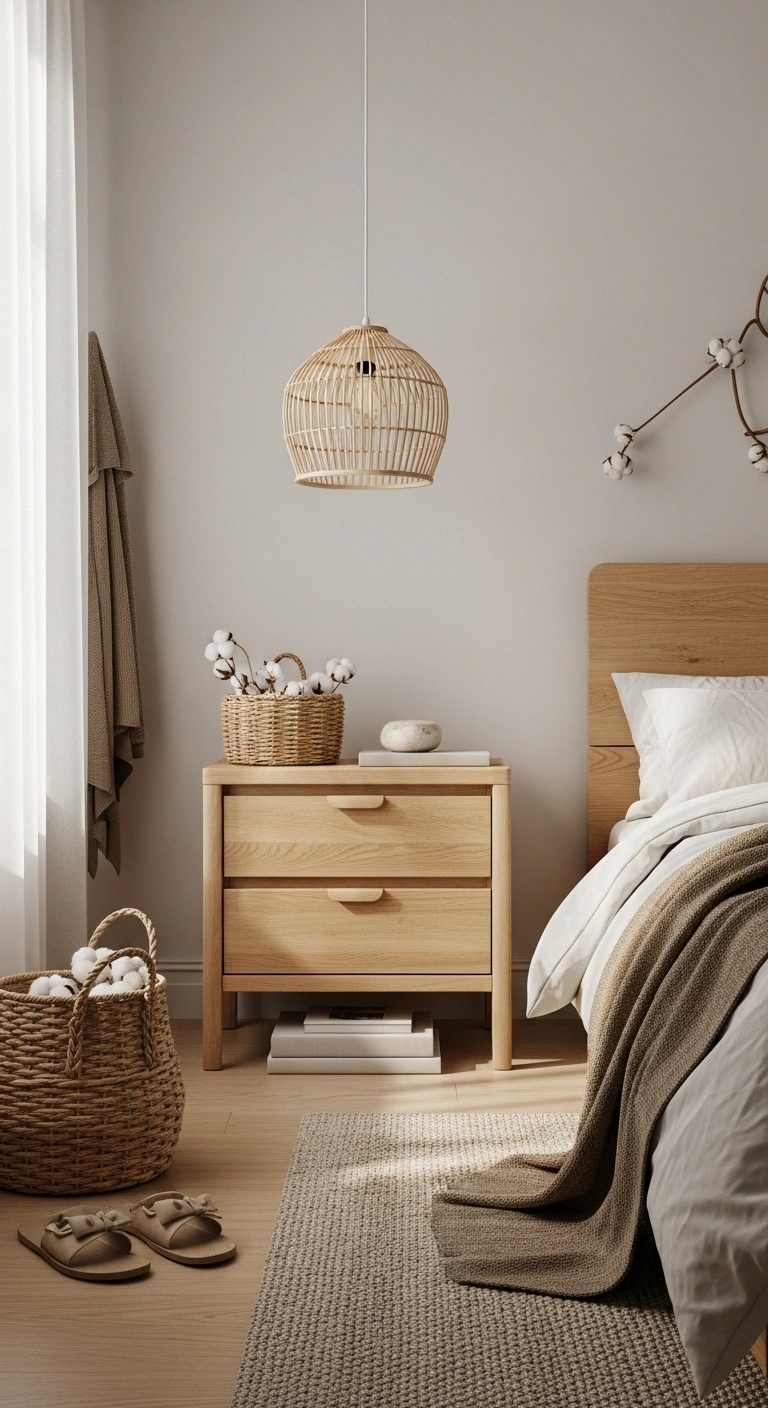 Bring in natural materials like light wood, rattan, or bamboo. These elements add warmth and a soft, organic feel to your bedroom.