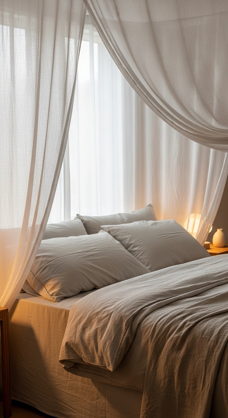Turn your bed into a soft focal point by adding a light canopy. Use sheer white or pastel fabric and let it fall gently from the ceiling or a simple frame. This creates a cozy, wrapped feeling without making the space heavy.