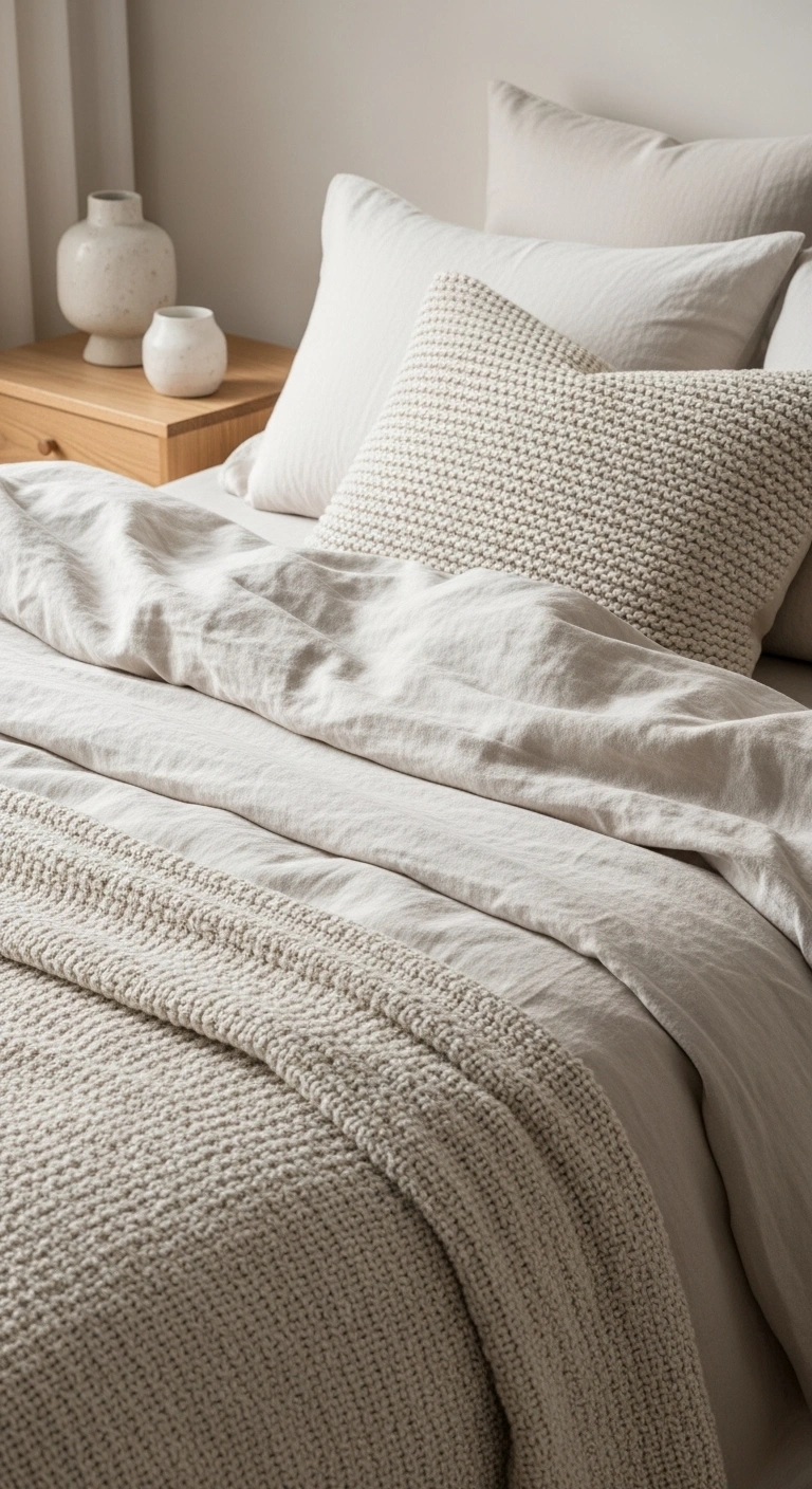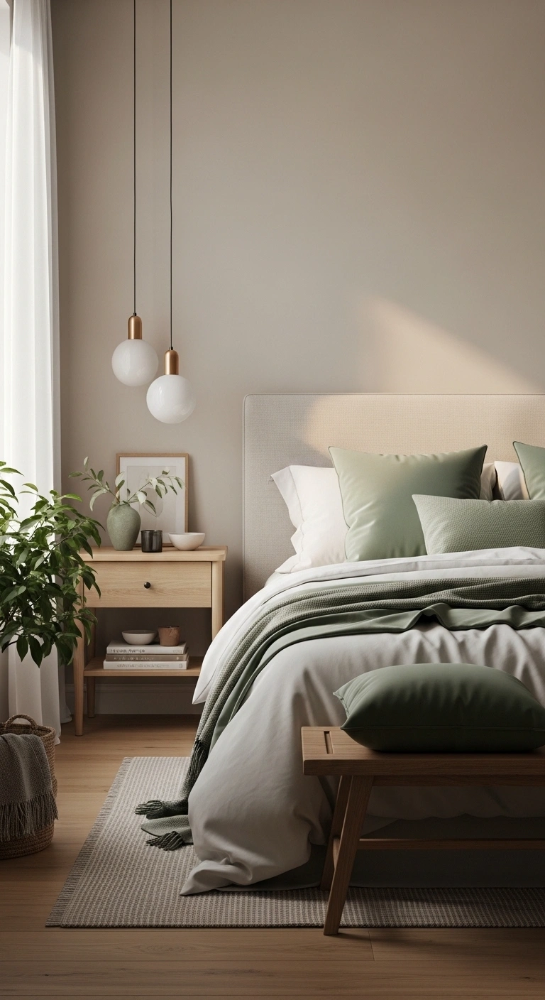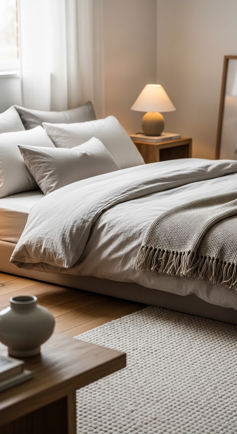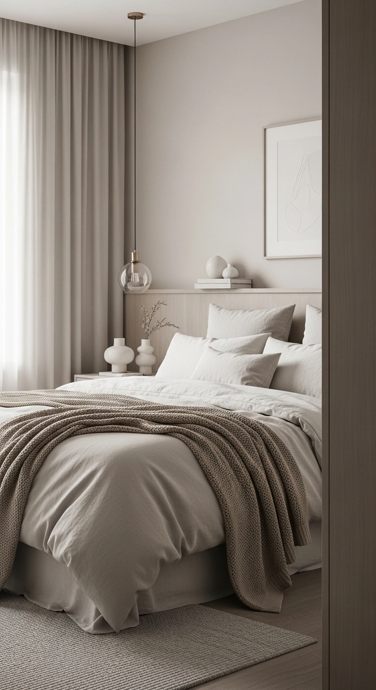 Start with a calm base using soft neutral shades like warm white, beige, and light taupe. These colors make the room feel open and peaceful without looking empty. Use layered bedding with different tones, such as cream sheets, a sand-colored blanket, and soft white pillows. This creates depth while keeping the look simple.