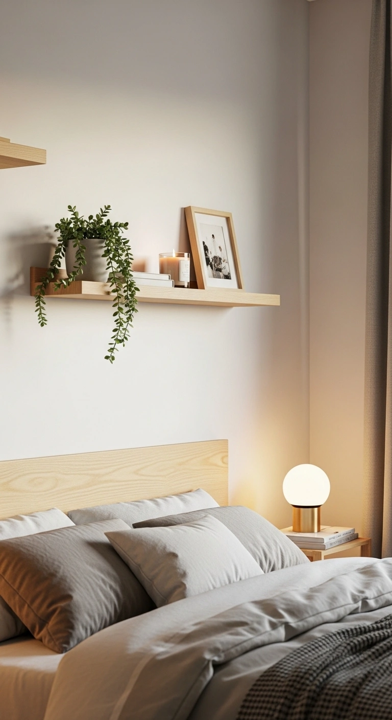 Choose shelves in light wood or painted in the same color as your wall for a seamless look. This keeps the focus on simplicity. The goal is to add personality without creating visual noise. This idea works well for keeping your bedroom organized while still looking aesthetic.