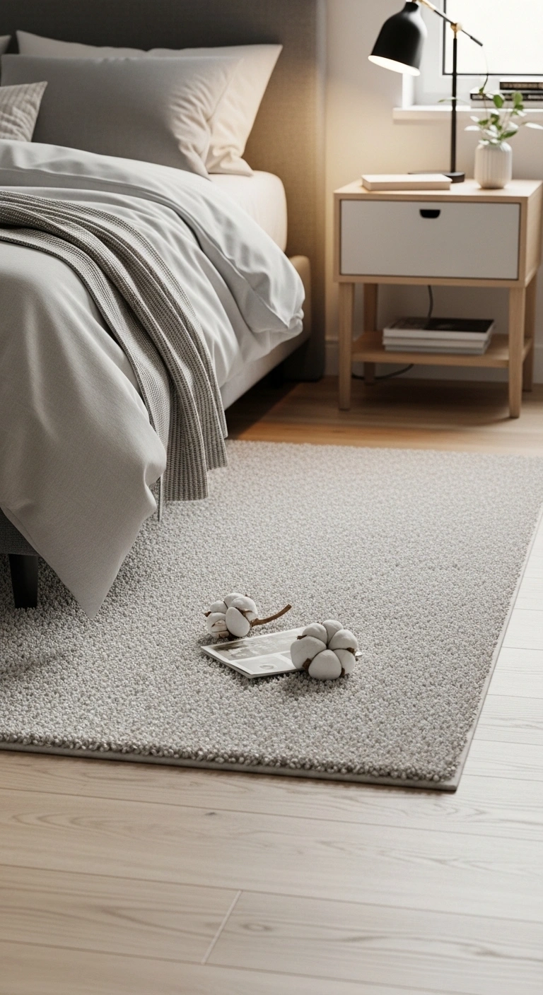 Place a soft rug under or beside your bed to make your room feel warmer and more inviting. Choose materials like plush cotton or wool in light, calming tones.