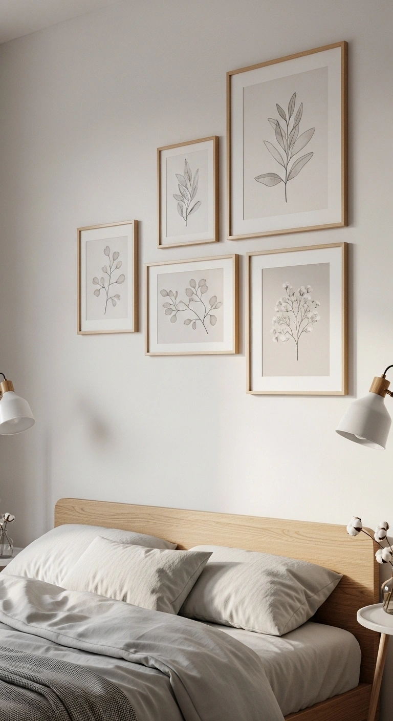Use thin, simple frames in wood or white to keep the look clean. Hang the art at eye level and keep spacing even for a balanced feel. This idea helps create a peaceful mood while adding personality to your bedroom.