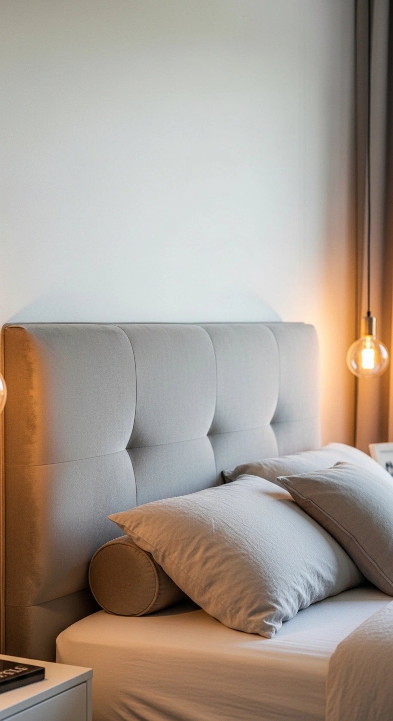 Add a soft fabric headboard to create a cozy focal point. Choose materials like velvet, boucle, or padded cotton in gentle colors. This adds both comfort and style to your bed area.
