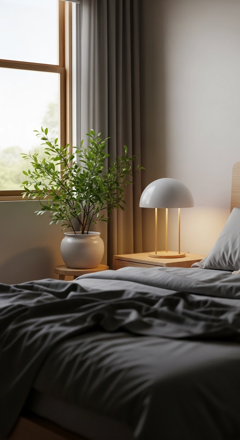 Bring life into your bedroom with a few indoor plants. Choose low-maintenance plants with soft green tones that add freshness without taking over the space.
