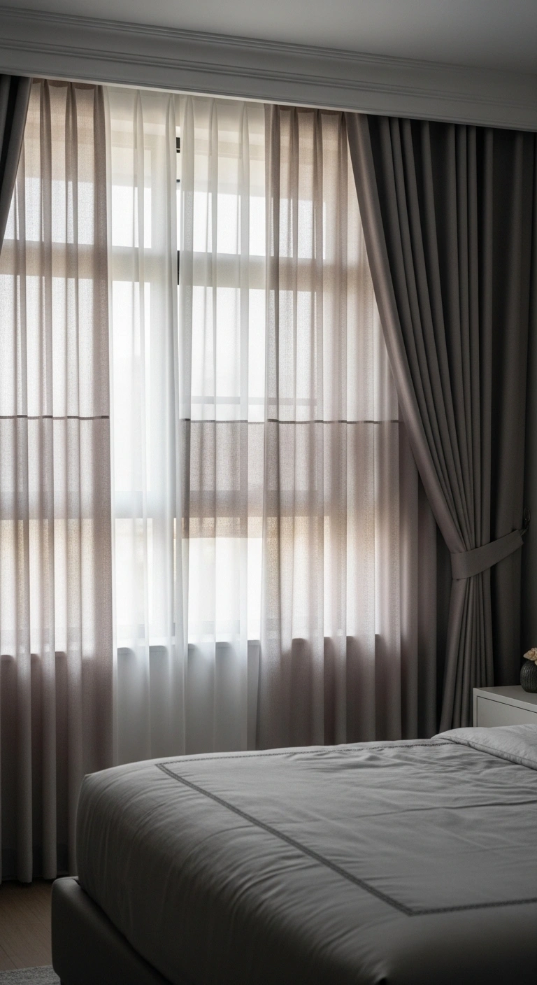 Use two layers of curtains to add depth and flexibility. Combine sheer curtains with slightly heavier ones in soft tones. This allows you to control light while keeping the room cozy.