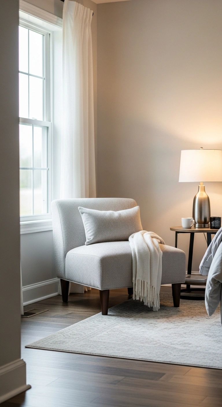 Place it near a window or next to a lamp to create a quiet space for reading or resting. Add a small cushion or throw for extra comfort. This idea adds function while keeping the bedroom calm and stylish.