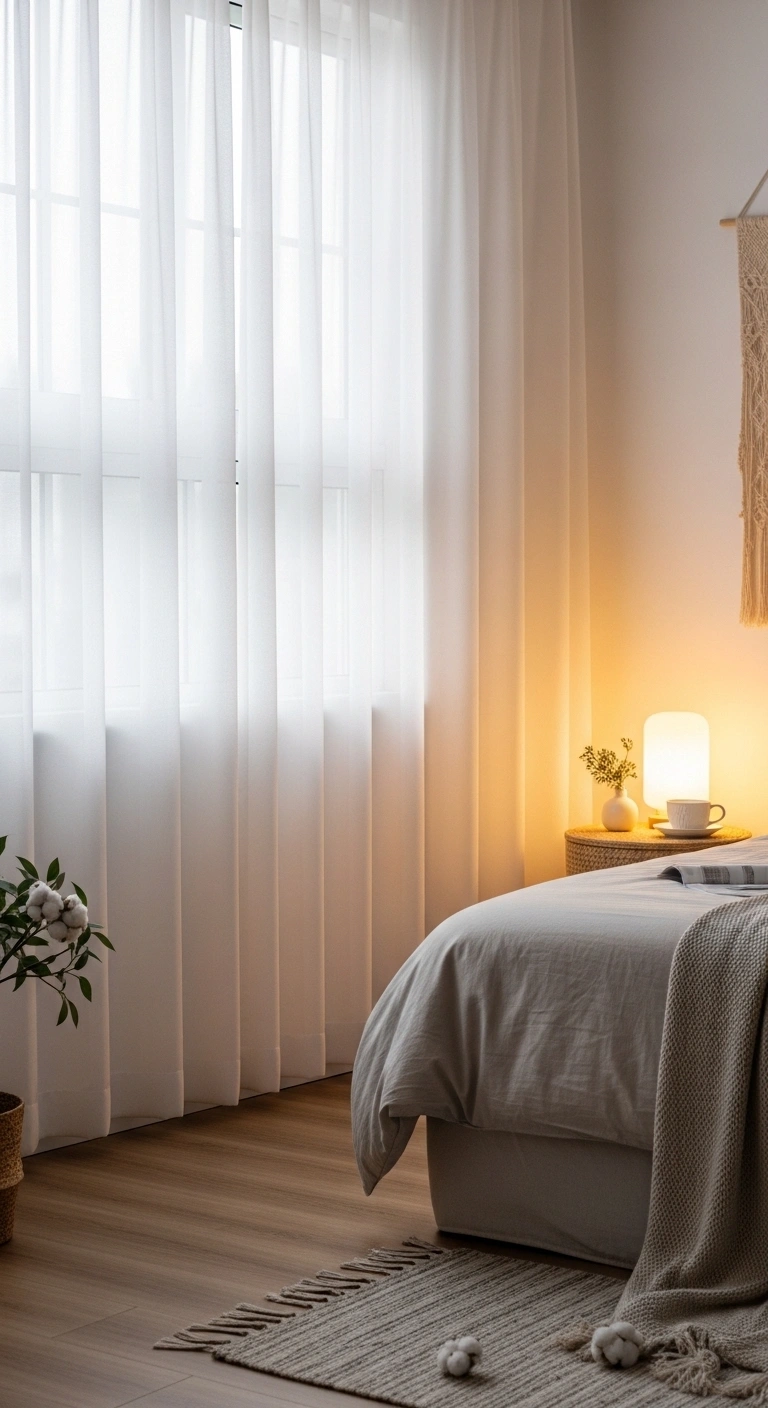 During the day, keep the sheer layer closed for a soft glow. At night, close the heavier curtains for privacy and warmth. This layering adds a rich, hotel-like feel while still staying calm and simple.