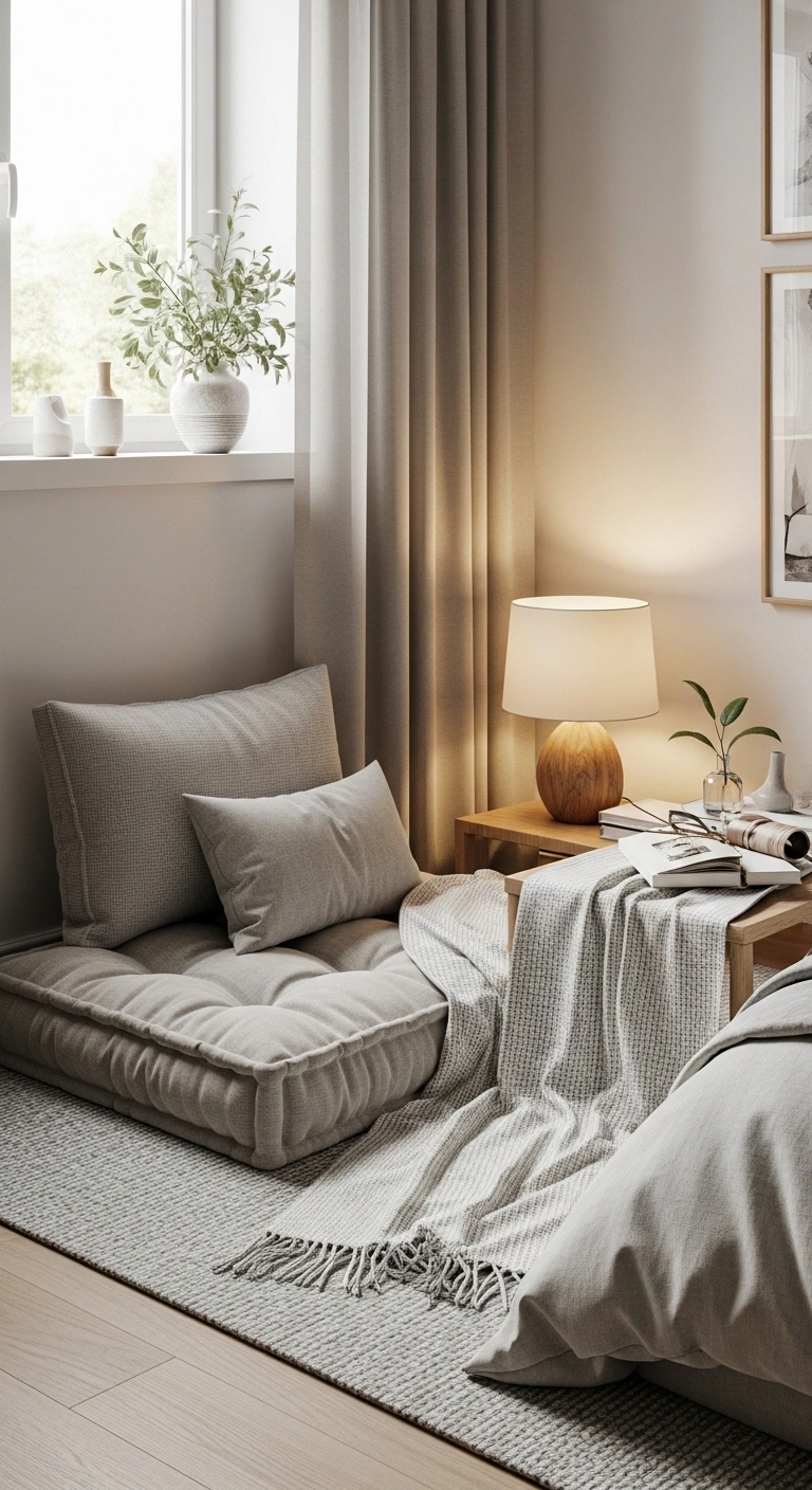 Create a small cozy corner where you can relax during the day. Use soft floor cushions, a light throw blanket, and a small side table. This space can be used for reading, journaling, or simply resting.