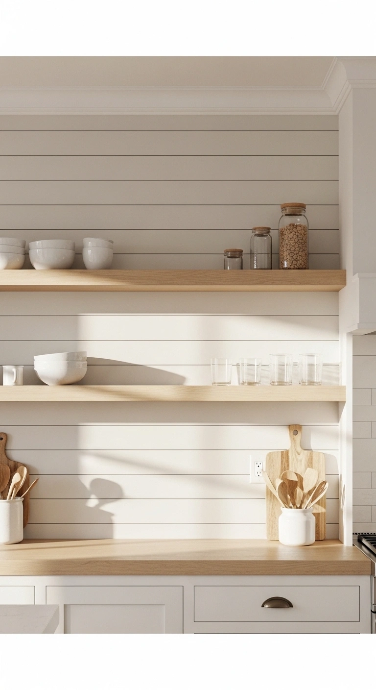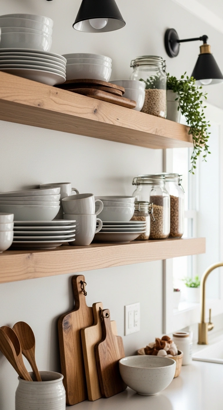 Choose thick wooden shelves with a slightly rough finish. Arrange items in layers by stacking plates, leaning cutting boards, and placing small jars in front. Use neutral tones like cream, beige, and soft gray, then add one or two darker elements like a black teapot or deep brown bowls.