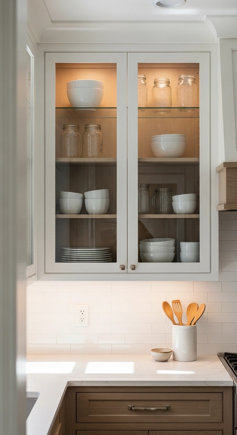 Style the inside carefully by placing neatly stacked dishes, neutral bowls, or glass jars. Keep colors soft and consistent to avoid a cluttered look. Add a small interior light inside the cabinet for a gentle glow at night. This creates depth and makes your kitchen feel brighter without adding extra decor.