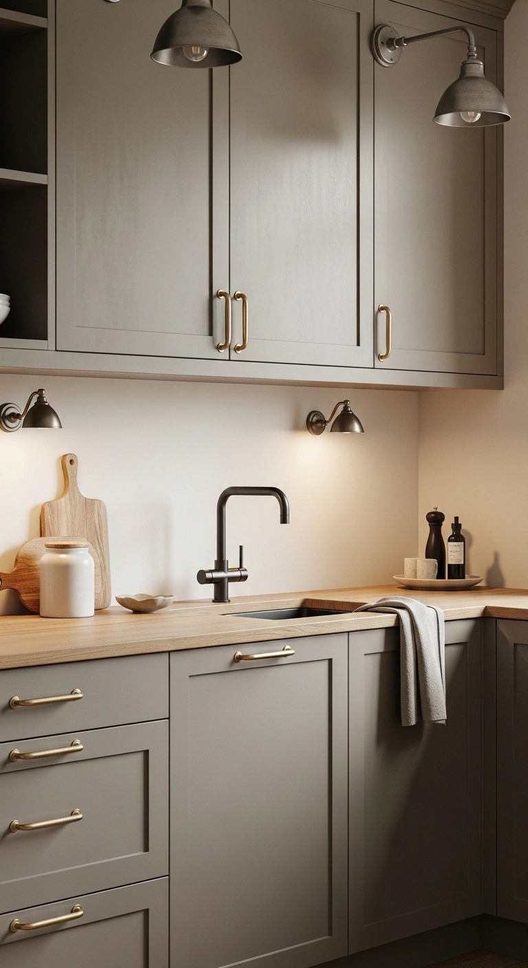 Pair cabinets with a butcher block countertop or floating wooden shelves. Use slightly aged wood with visible grain to bring texture into the space. For a deeper effect, add a wooden island in a slightly darker tone than your shelves. This layered contrast creates depth without overwhelming the room.