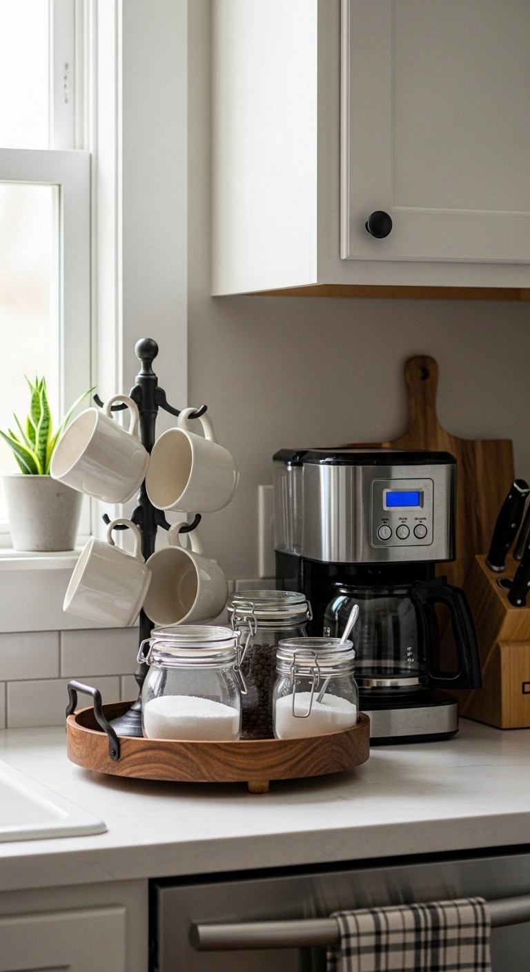 Use a small section of the counter or a side cabinet. Add a wooden tray to hold your coffee maker, mugs, and jars of beans or sugar. Choose ceramic or glass containers for a clean, farmhouse feel. Hang a few hooks above to display favorite mugs.