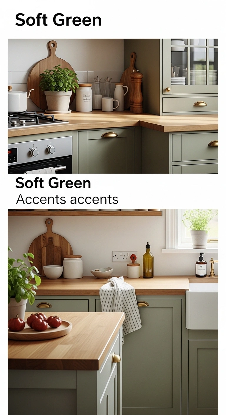 Introduce green through painted cabinets, a backsplash, or smaller accents like vases and dishware. Choose muted shades like sage or olive instead of bright greens. Pair them with wood and white surfaces to keep the look balanced.