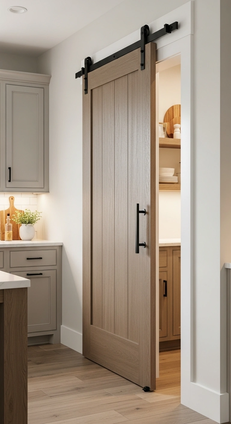 A sliding barn door adds strong farmhouse character while saving space. It works well for pantries, utility areas, or kitchen entrances.
