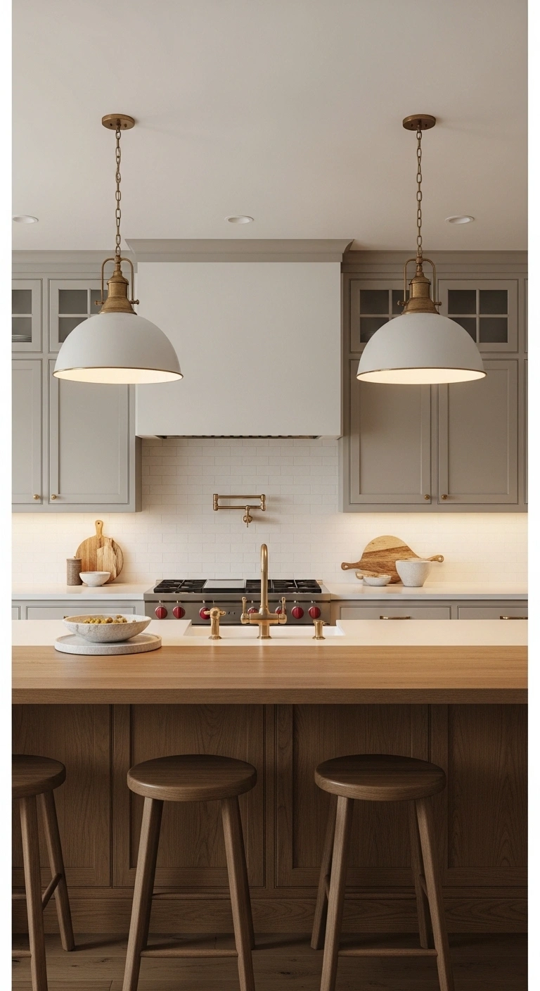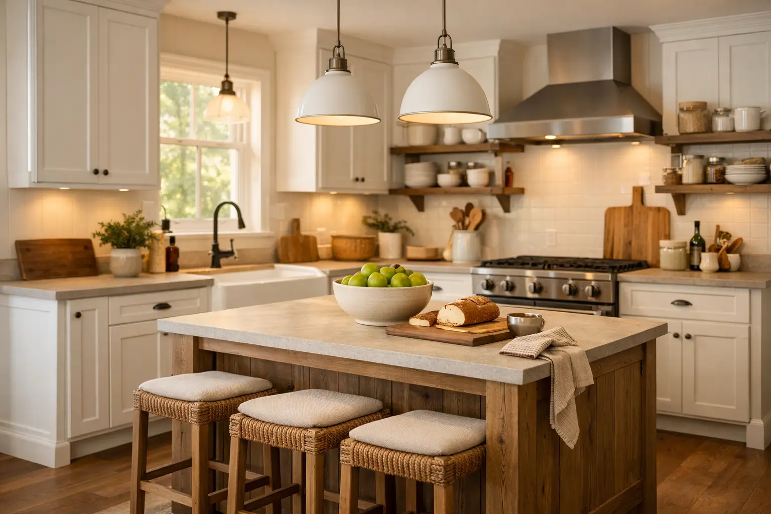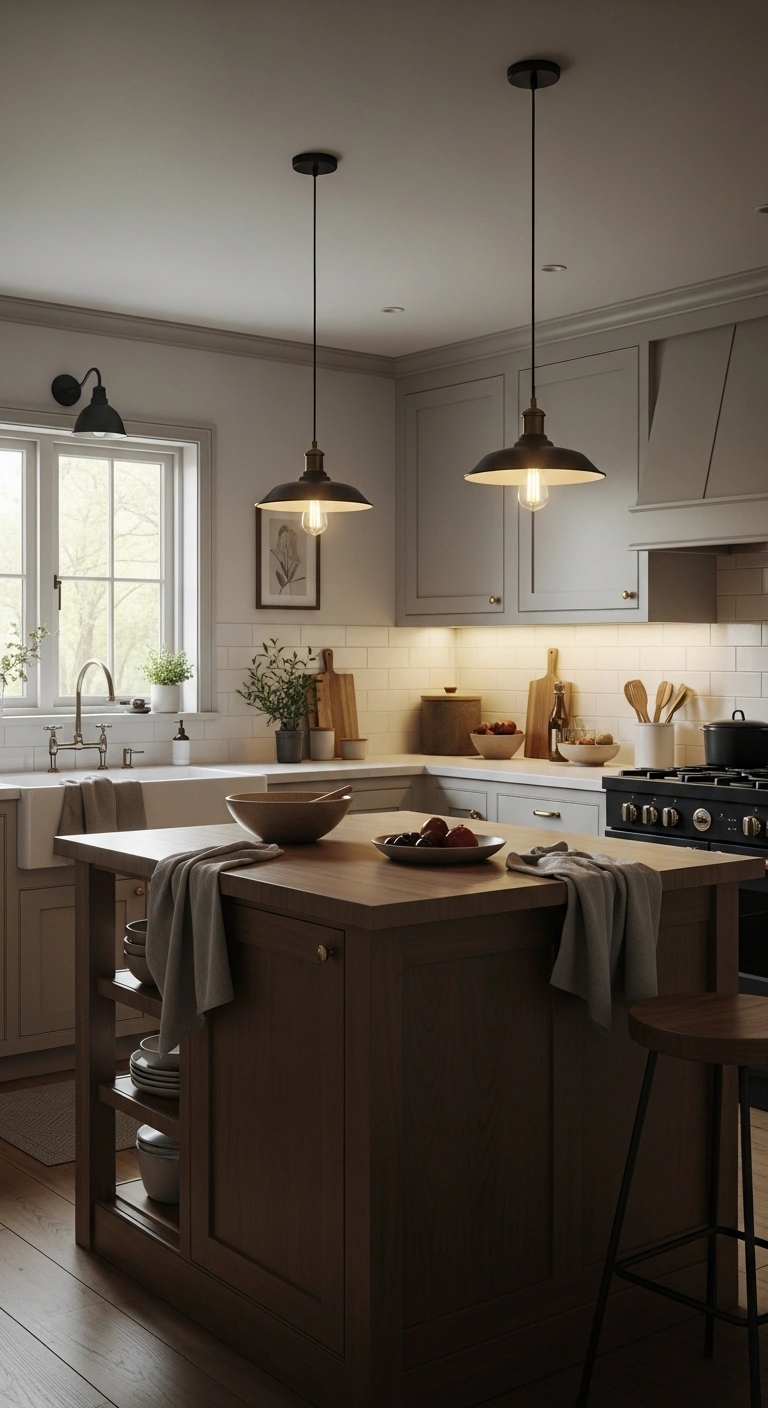 Lighting shapes the mood of your kitchen more than any other element. A farmhouse kitchen needs soft layers instead of one harsh overhead light.