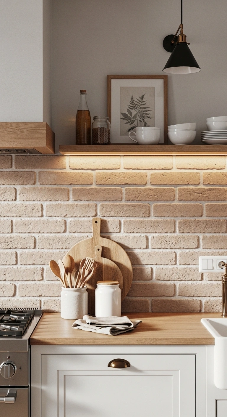 A textured backsplash adds depth and warmth without relying on bold colors. Brick or stone works especially well in farmhouse kitchens.