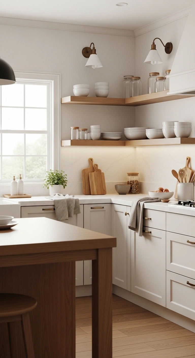 Start with a clean base using soft white cabinets, then add warmth through natural wood elements. This balance keeps your kitchen bright while avoiding a flat or sterile look. Choose creamy whites instead of stark tones to create a cozy feel, especially under natural daylight.