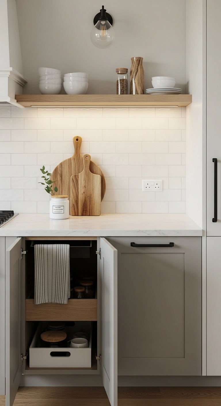 A clean countertop makes your kitchen feel calm and organized. The key is to store items in a way that keeps them accessible but out of sight.