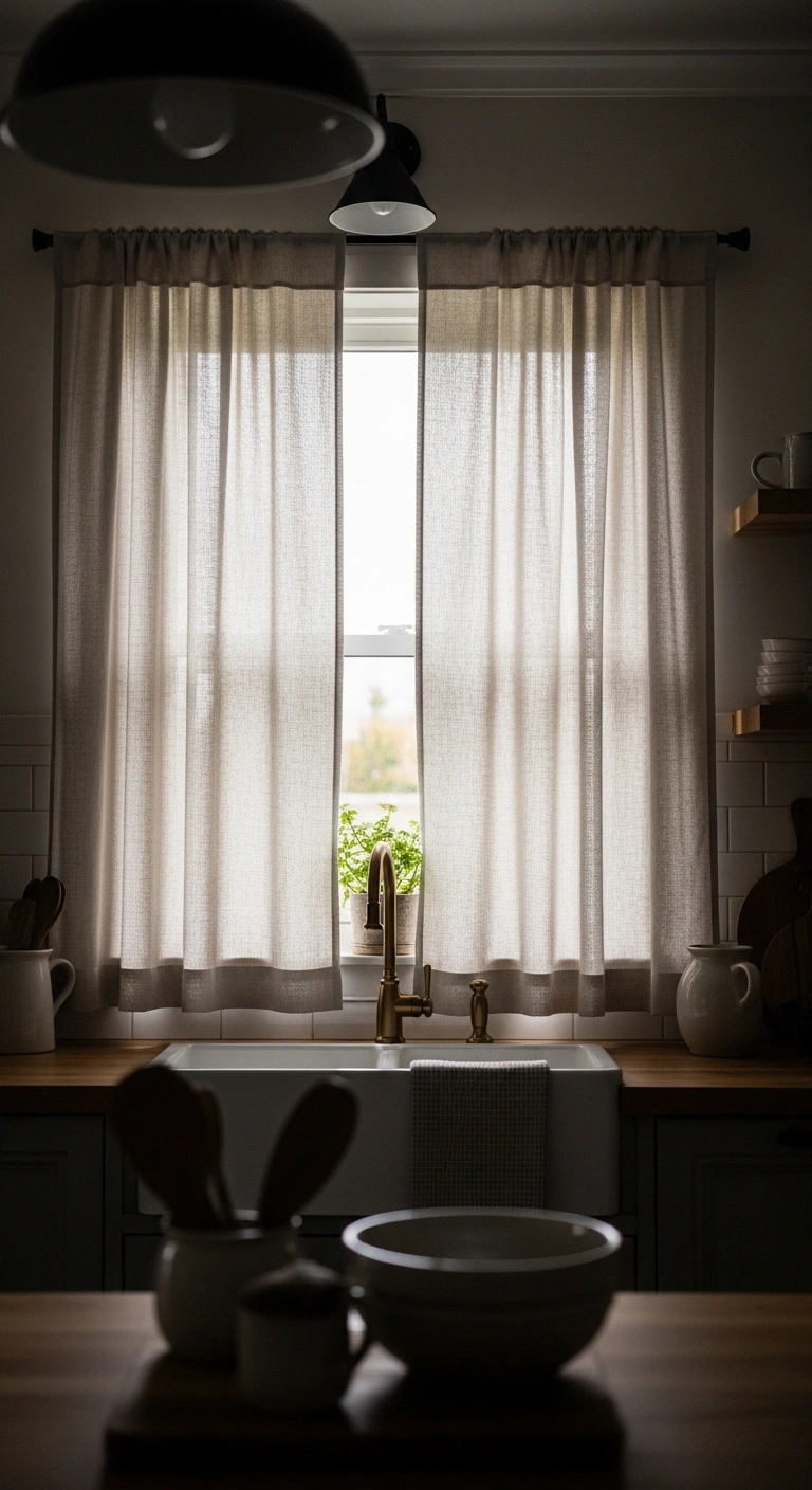 Use linen curtains or simple Roman shades in neutral tones. Let them filter sunlight instead of blocking it completely. This keeps the kitchen bright while adding a gentle layer of texture.