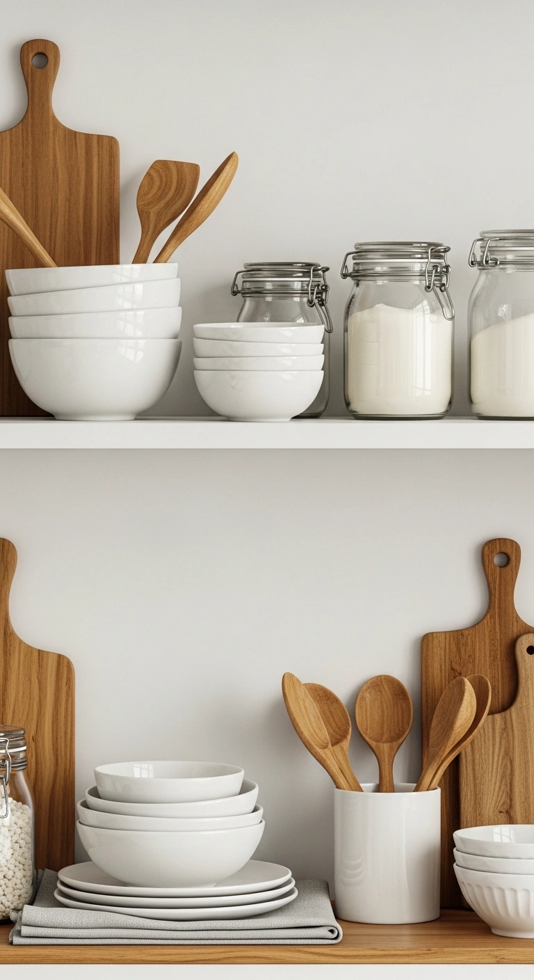 Display items like bowls, jars, or utensils in an organized way. Use trays or shelves to group them neatly. Stick to a consistent color palette so the display feels intentional.