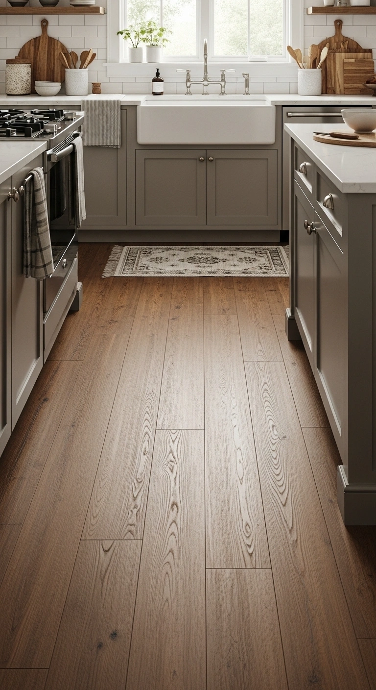 Flooring plays a big role in how your kitchen feels. Warm-toned floors help anchor the space and tie all elements together.