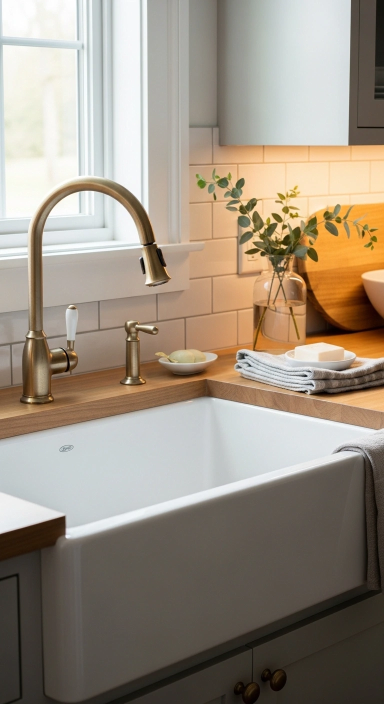 Choose a white apron-front sink for a classic look, or go for a stone or matte black version for a modern twist. Pair it with a tall, curved faucet in brushed brass or antique bronze. This combination adds height and elegance without feeling too polished.