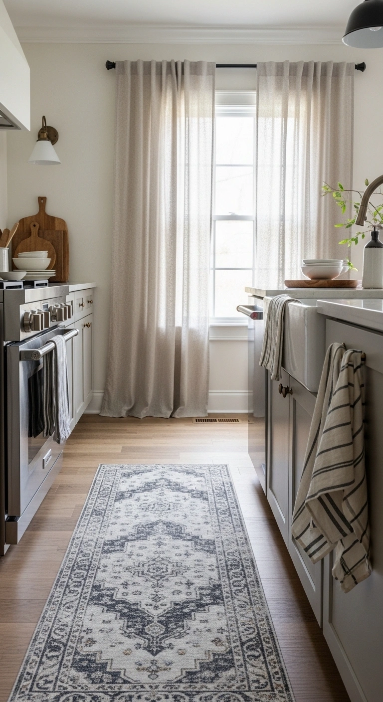 Start with a runner rug in muted tones like faded red, soft blue, or earthy beige. Look for patterns that feel slightly worn or vintage-inspired. Add linen curtains or Roman shades with light texture to filter natural light.