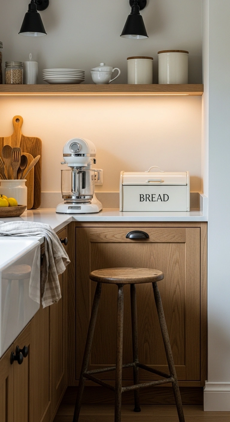 Use a vintage wooden stool, an antique scale, or an old bread box as accents. Place them alongside sleek appliances or clean countertops. This contrast makes the space feel collected over time rather than designed all at once.