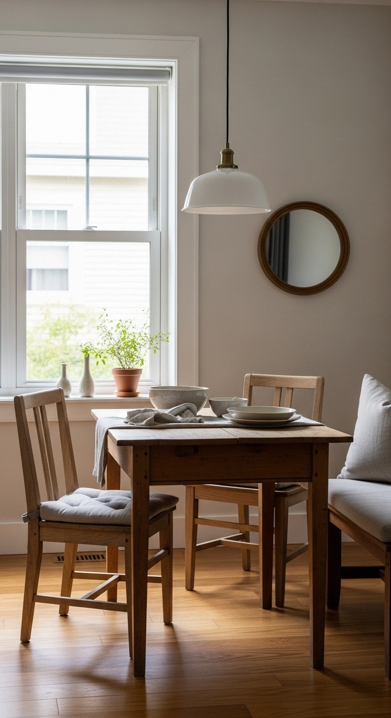 Use a wooden table with a slightly worn finish and pair it with simple chairs or a bench. Add soft cushions in neutral fabrics to make seating comfortable. Position the table near a window if possible to bring in natural light.