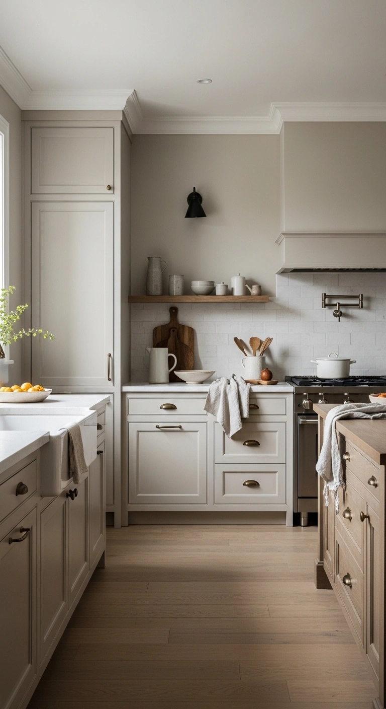 Start with a base color like soft white or light beige. Then add slightly darker tones through cabinets, walls, or decor. Use warm grays, muted greens, or sandy tones to build variation.