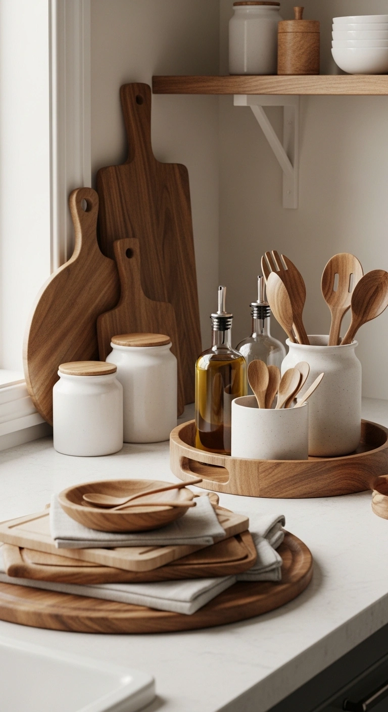 Display cutting boards in different shapes by leaning them against the backsplash. Use wooden trays to organize oils, spices, or utensils on the counter. Choose items with visible grain and slightly imperfect edges for an authentic feel.