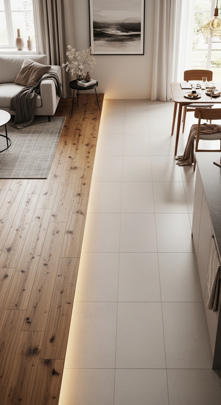 Mixing different flooring materials can visually divide your living room without using walls. For example, you can combine wood flooring with tiles or stone to create separate zones for seating and dining areas. This approach works especially well in open-plan spaces where you want clear structure.
