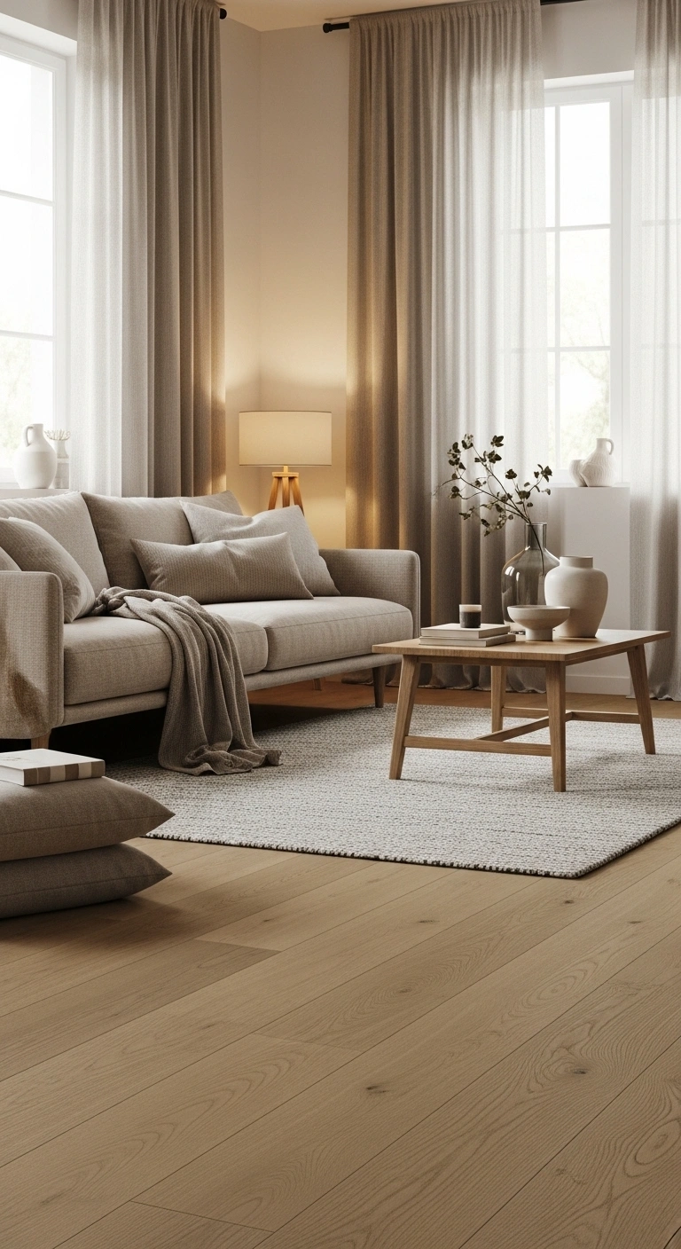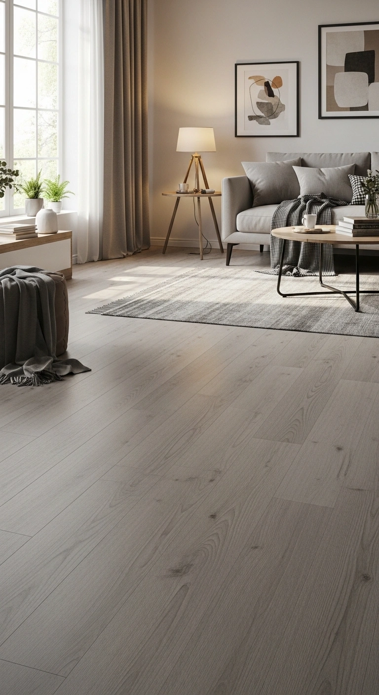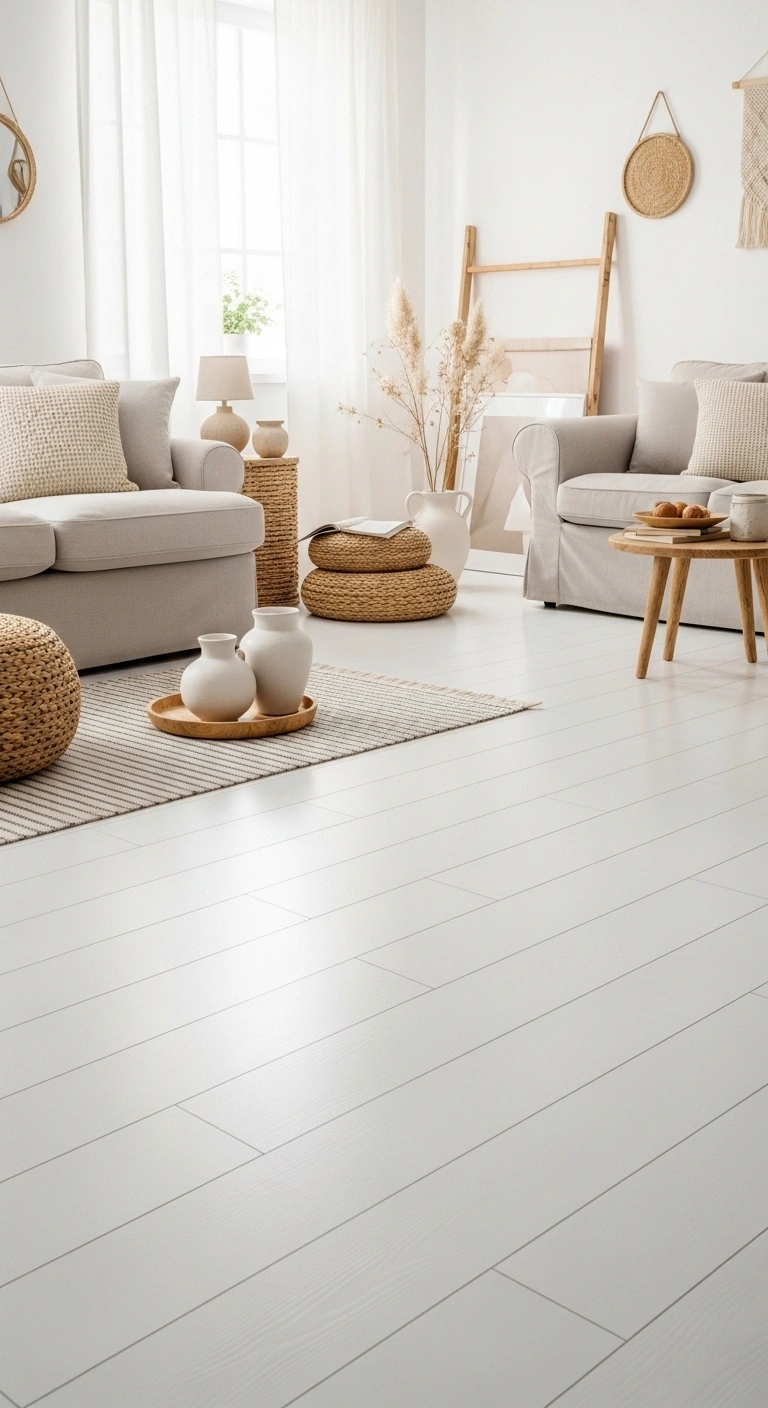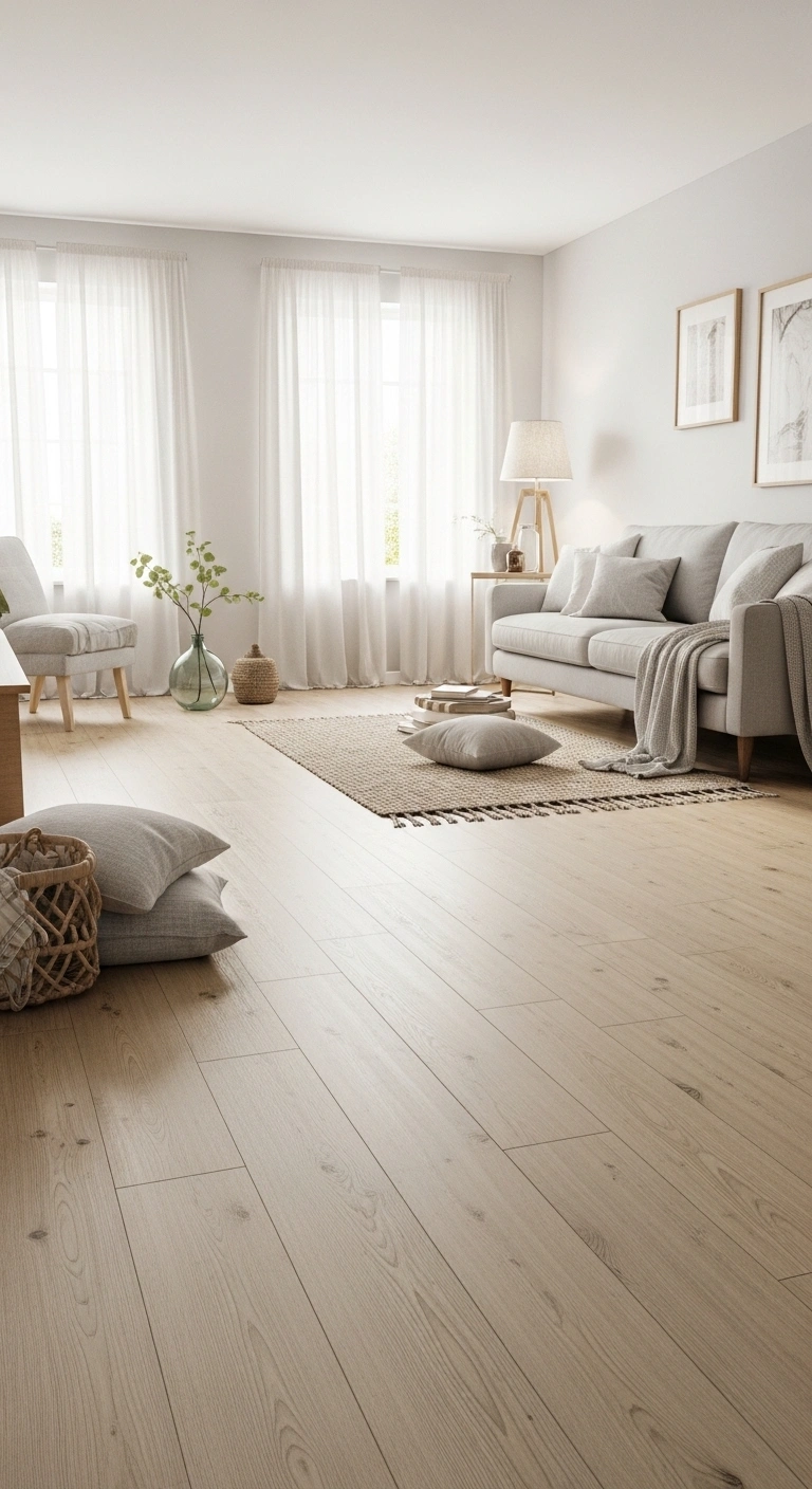 Pair this flooring with light fabrics like cotton and linen in soft beige, pale blue, or warm gray. Add woven baskets, light wood furniture, and simple décor to keep the space relaxed. A striped or textured rug can add depth without taking away from the clean look. This style works beautifully if you want a peaceful, airy living room that feels easy to live in every day.